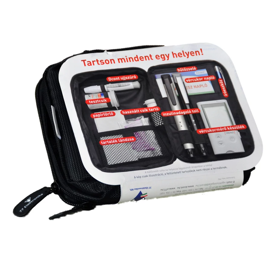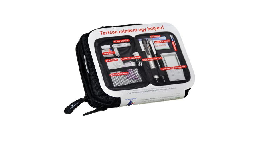 - Kiegészítők helye: Külön rekeszek vércukormérőhöz, tesztcsíkokhoz, naplóhoz és egyéb szükséges eszközökhöz.